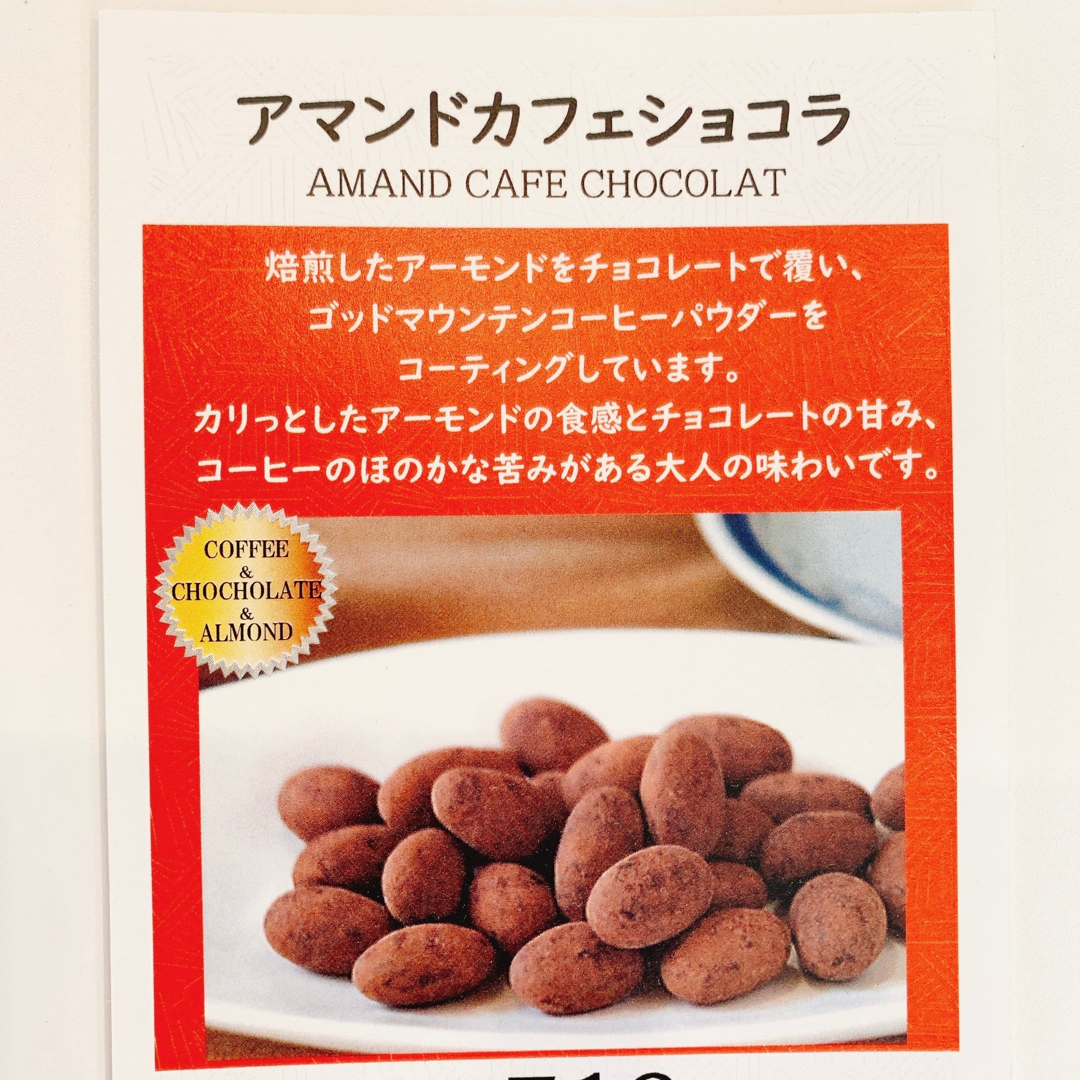 カリッとしたアーモンドの食感とチョコレー トの甘味とコーヒーのほのかな香りを楽しめ ます